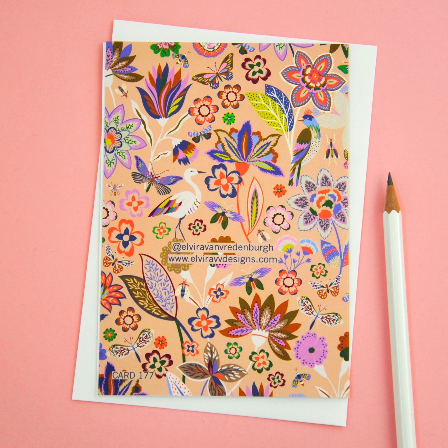 Her designs, inspired by vintage patterns and the natural world, begin as delicate pencil sketches that blossom into vibrant, full-colour pretty designs. She is committed to sustainability, using biodegradable cellophane wraps for all my cards to ensure our products are as kind to the environment as they are beautiful.