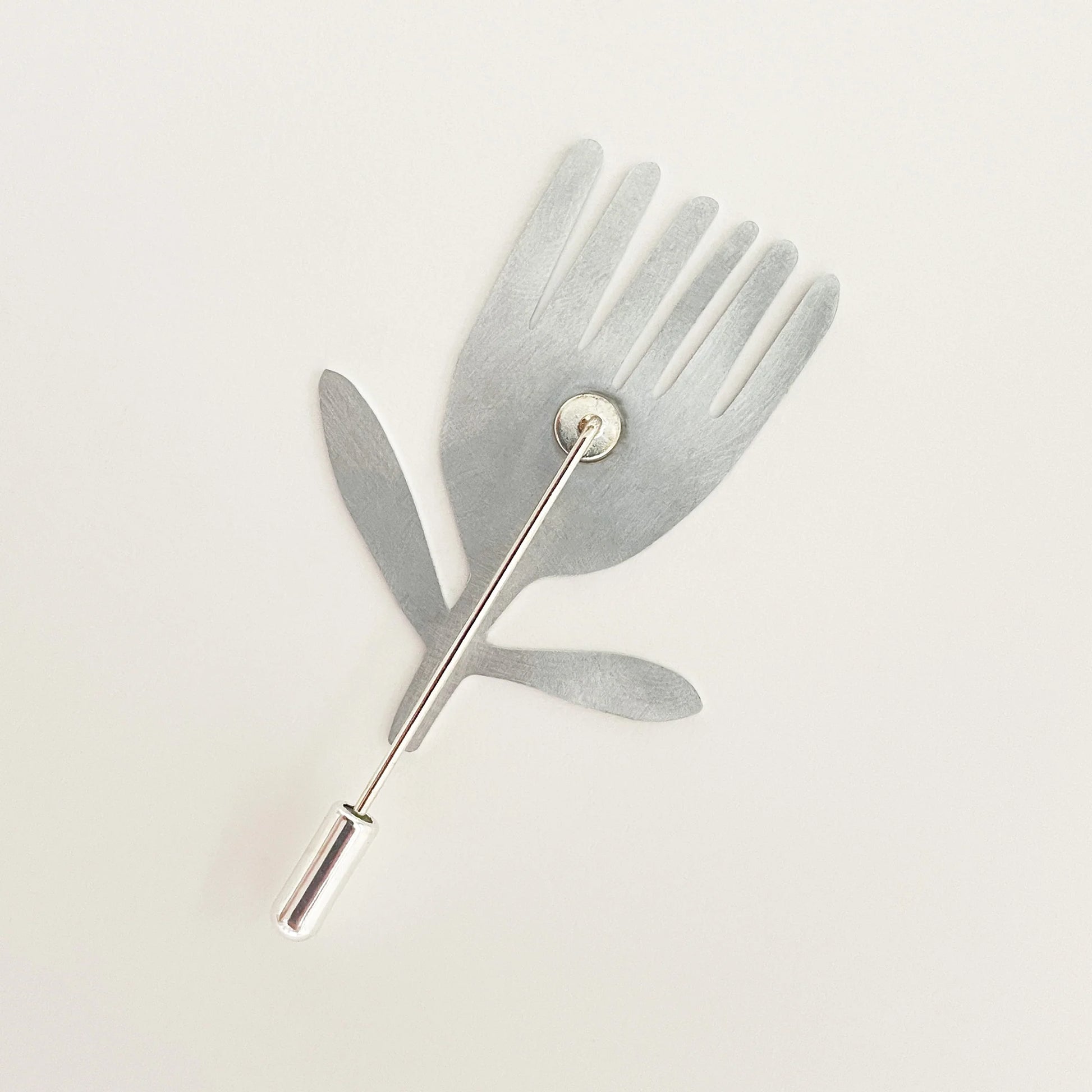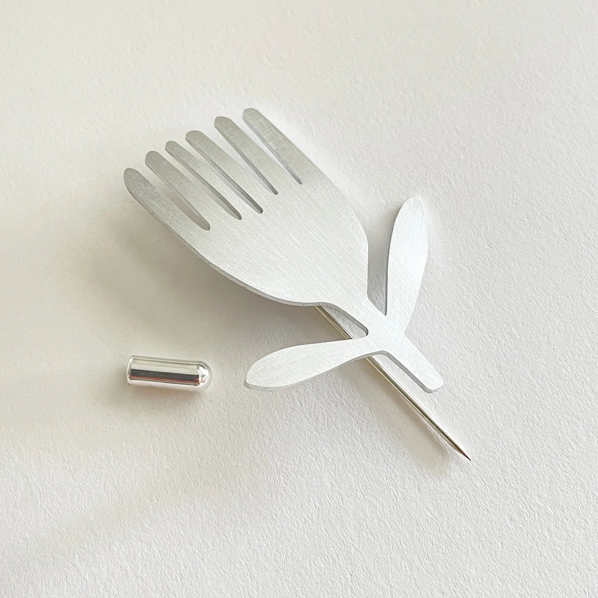 Crafted in matt brushed aluminium , this pin brooch has a silver plated stick pin and protector and is presented in a beautiful Tom Pigeon white sliding box.
