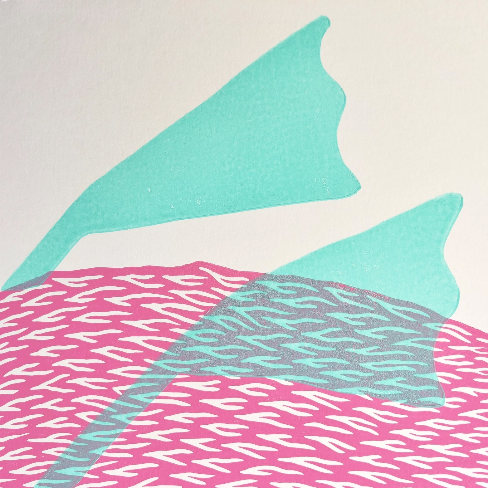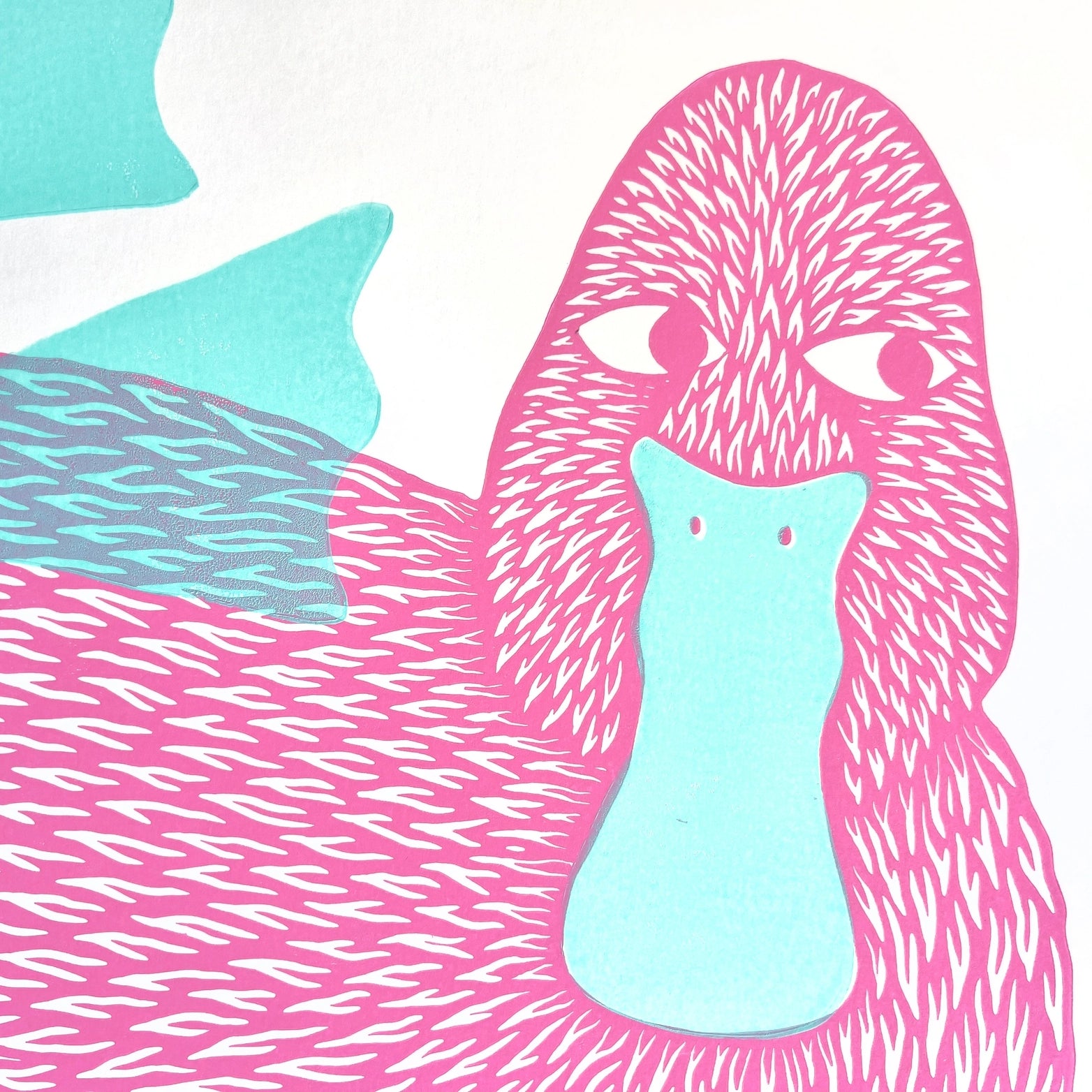 Hand carved linocut Printed in oil based ink in Pink and mint green.