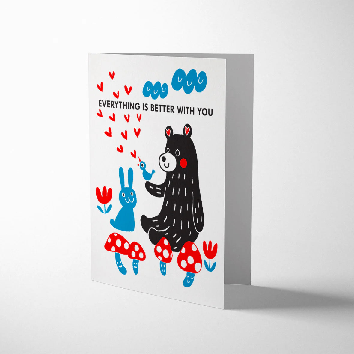 There are people that make the day feel lighter—the air seems brighter, the edges softer, the mushrooms are smiling and that's when you realise: everything really is better with them. Designed by Fugu Fugu Press, letterpress printed by 1973 in bold, joyful colour — for the ones who make the world a better place.