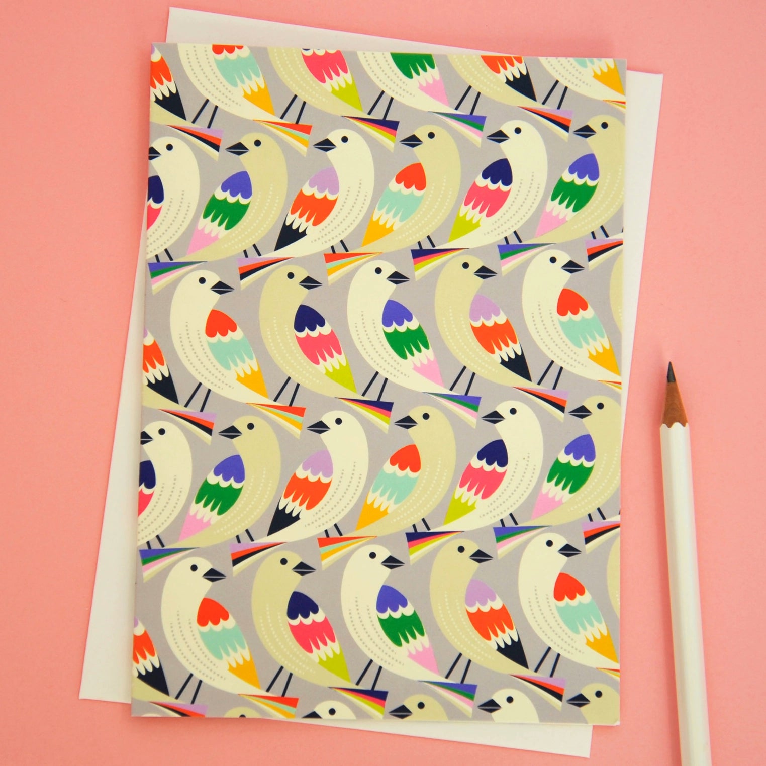 Birds in a Row Greetings card Colourful birds illustrated greetings Card. Can be used for birthdays, Mother's day, weddings, anniversary and Easter.