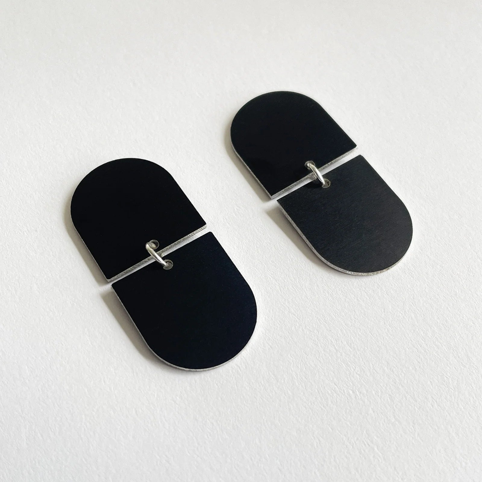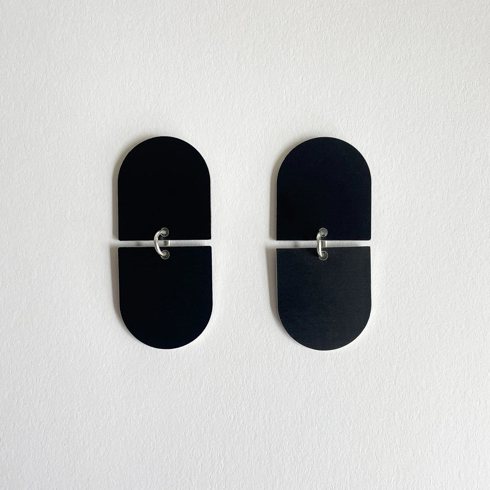 Cousins is a collection of handcrafted jewellery playing with opposing and matching geometric forms. These matte black earrings are bold, playful and super-simple. .