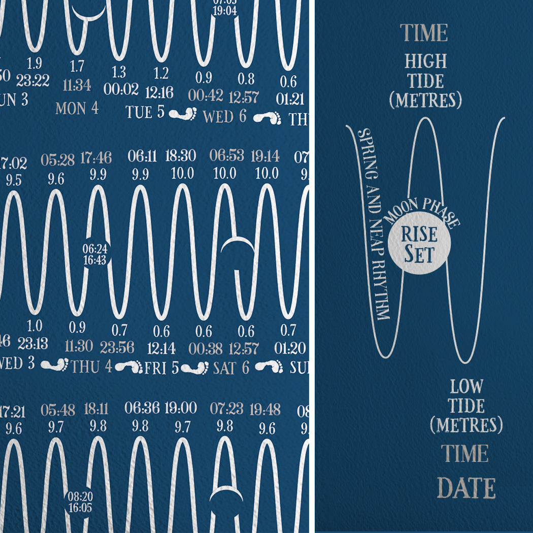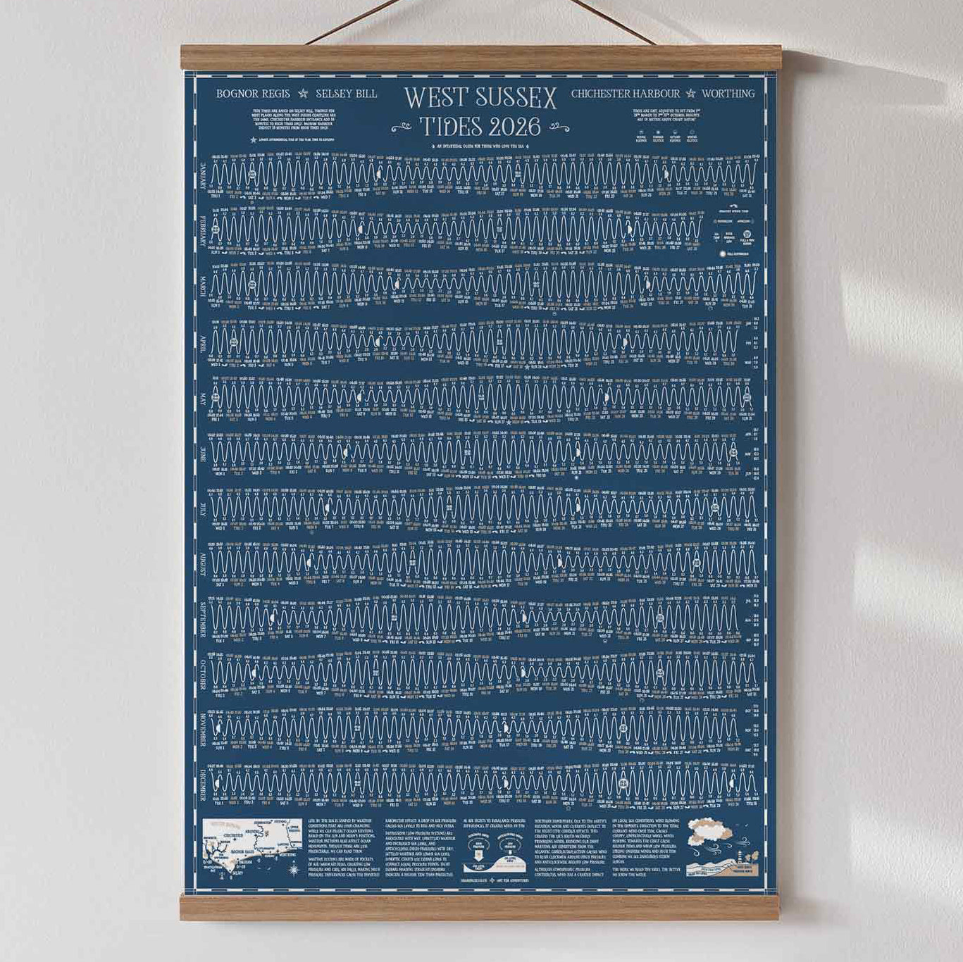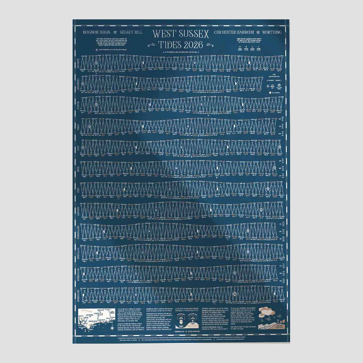 Unique tide times hydrographical charts for the Brighton, Hove, Worthing, Shoreham and Seaford coastline. A full year of tide times and heights with a wealth of local tidal, moon and ocean information and in 2026 a guide to coastal weather. Life by the sea is shaped by weather conditions that are ever changing, the more we read the skies, the better we know the water.