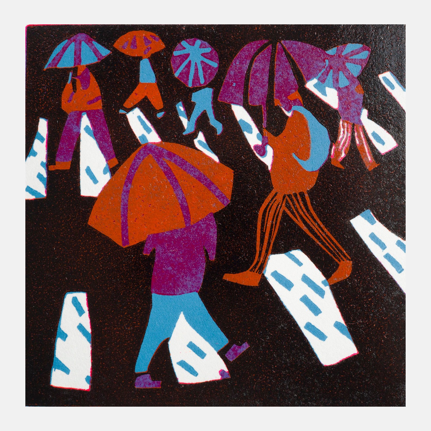 She uses vivid colours and bold shapes to create detailed, textured prints which have a sense of movement and strong graphic quality. Her paintings celebrate snapshots of a place at a specific time, like a photograph taken as a tourist to keep.