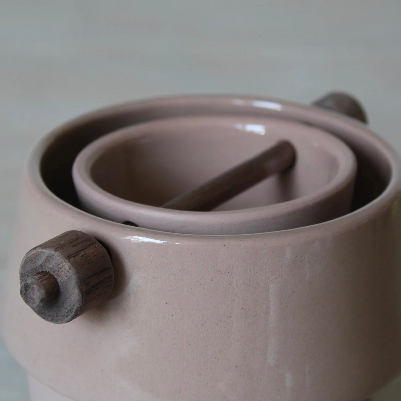 Materials: Porcelain with transparent glaze. Unglazed base. Beech dowel.
