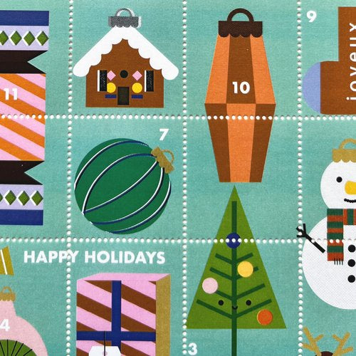A large sheet of decorative festive stamps for the month of December. Tear them off one stamp per day or leave as a sheet to display as a print. Great for decorating mail, gifts and for crafting.