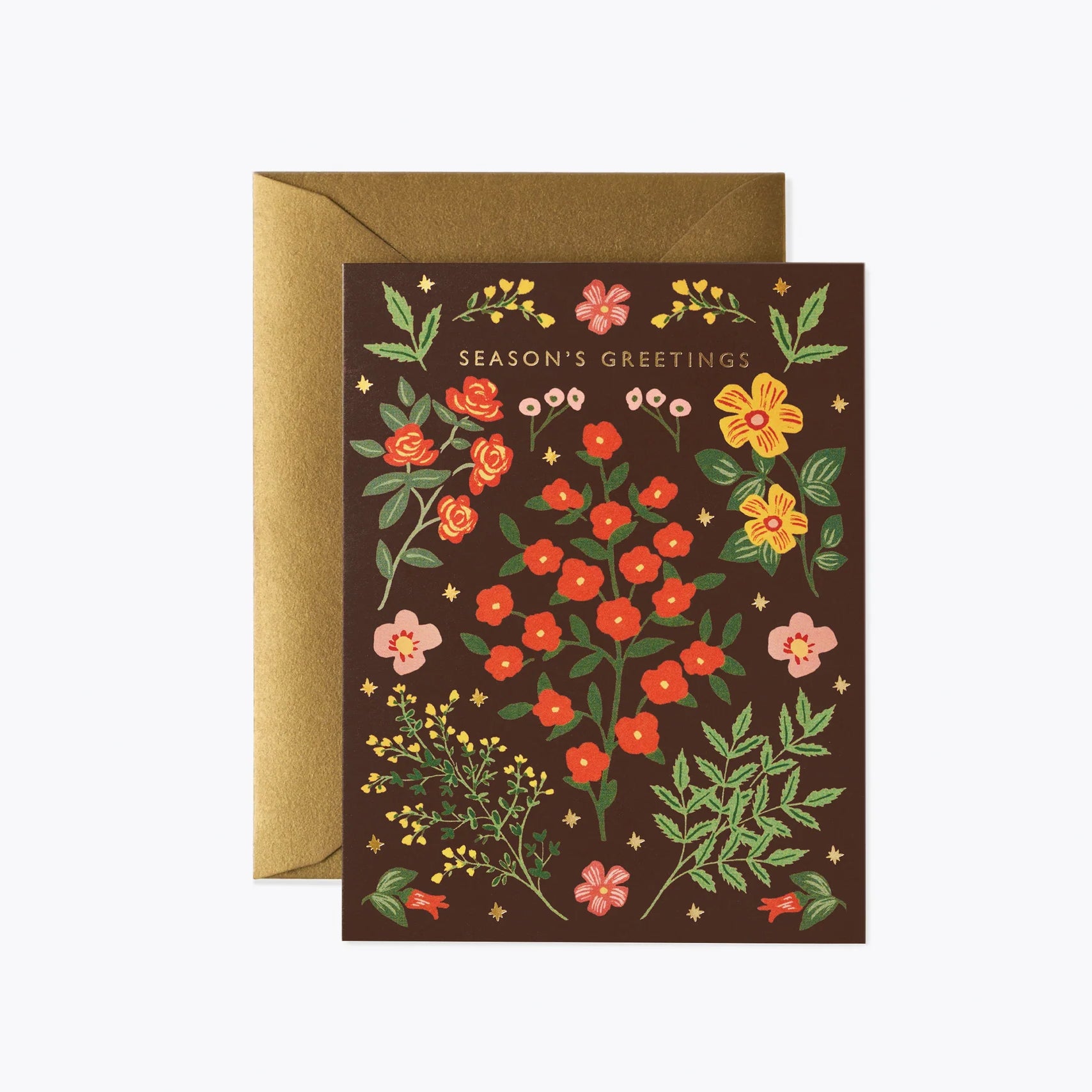Season's Greeting with a wintery, floral theme. This card is perfect for sending warm Christmas wishes to all your loved ones.