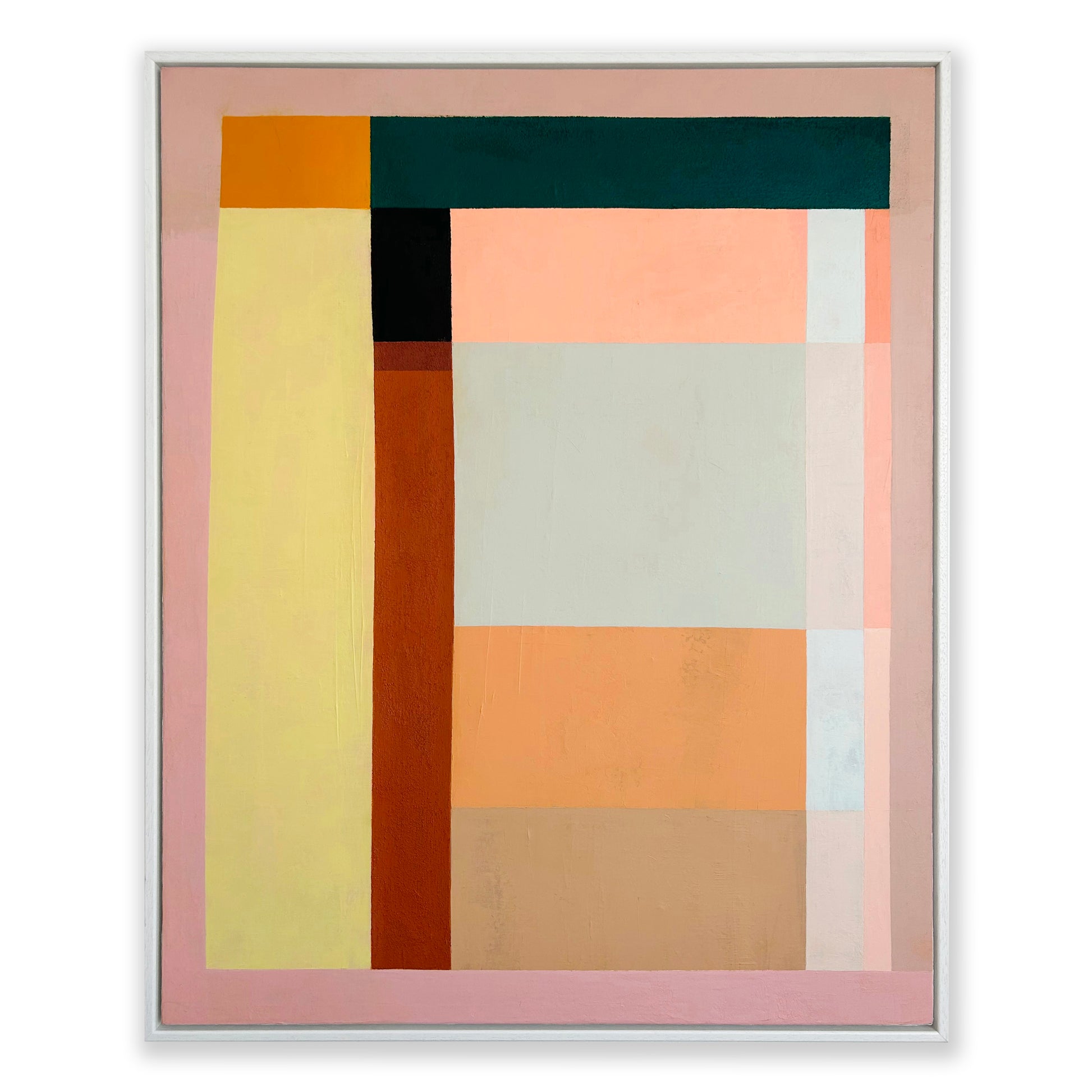 Acrylic on canvas, framed in a white wooden box frame. Signed by the artist. This painting has a hanging wire on the back, ready to be hung.