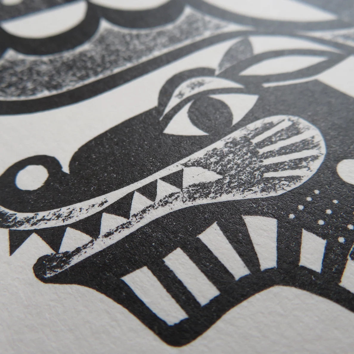 Her work often starts with small paper cut motifs or ink drawings, which are then developed into final designs ready to be transferred to the lino or silk screen.