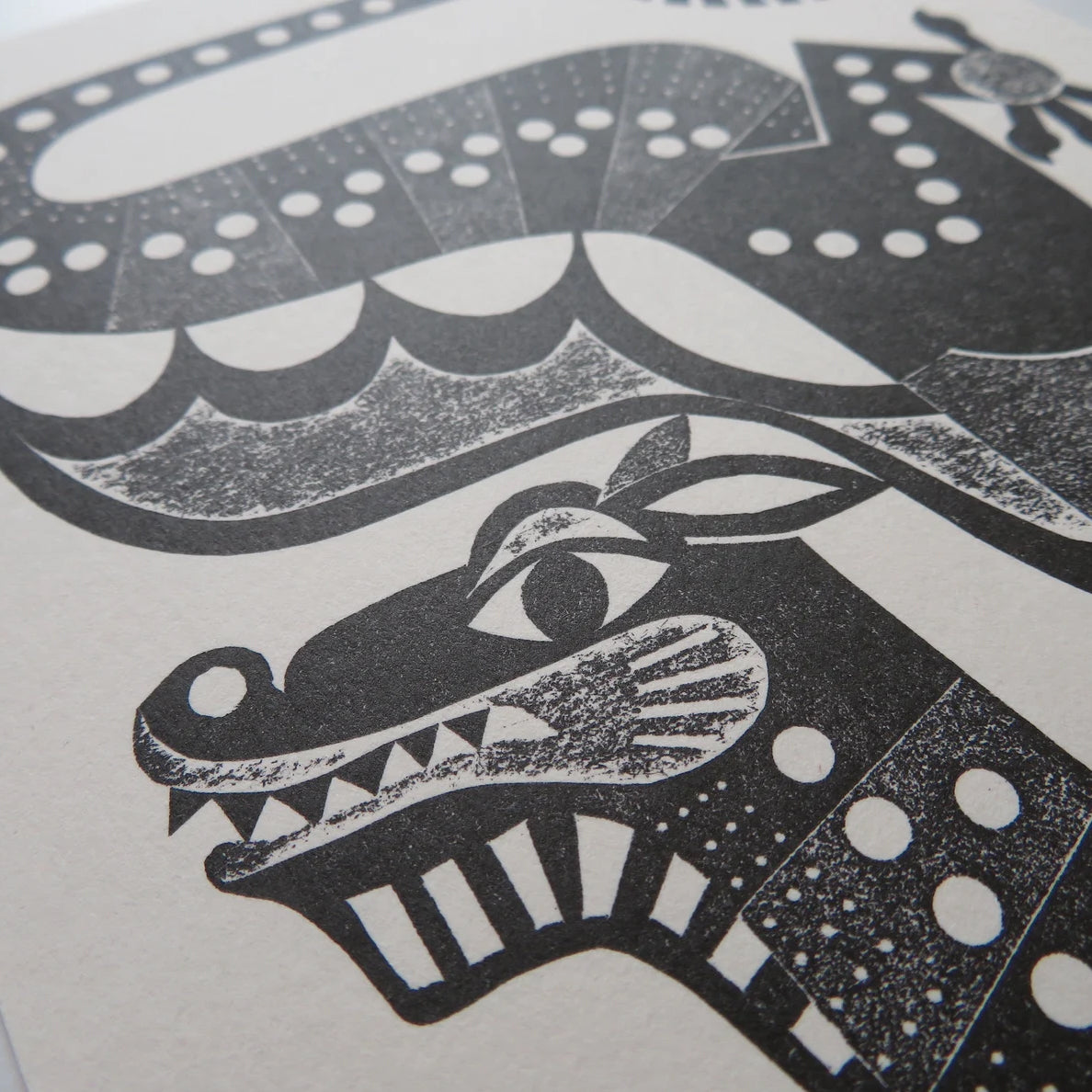 Claire Spencer is a printmaker living and working in rural Wales. She makes bright, modern linocuts and screen prints, originally training in Metalwork and Jewellery, gaining an MA from the Royal College of Art.