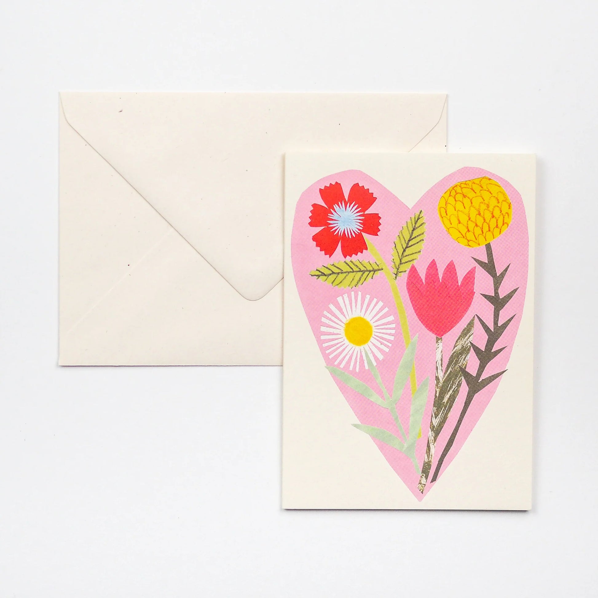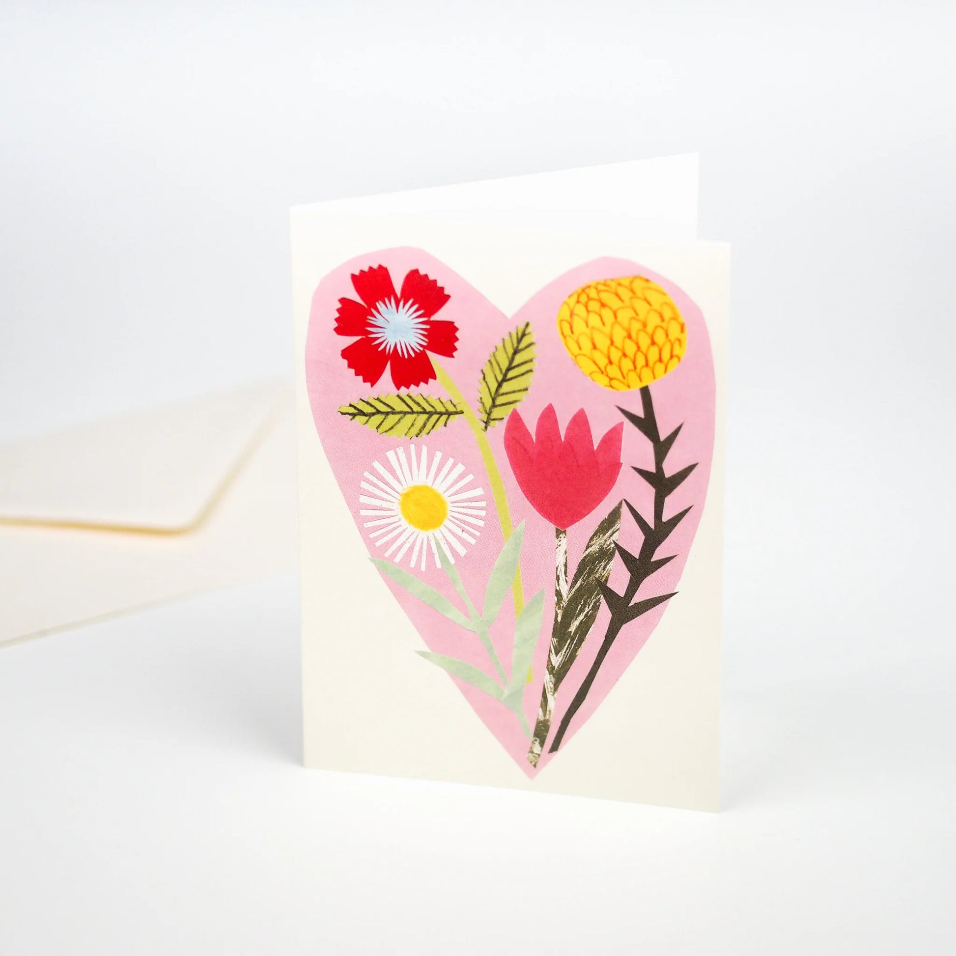 A beautiful bouquet of hand-collaged wild flowers layered on a soft pink heart.