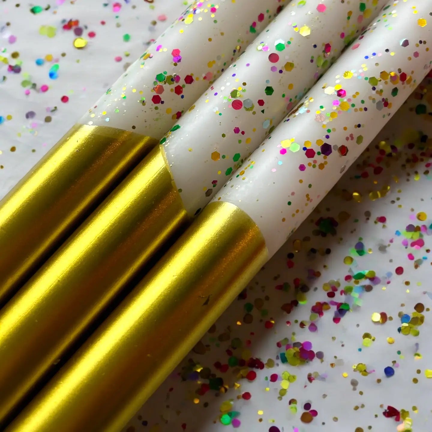 The Colour Emporium presents this festive dip dye trio in festive gold and colourful glitter perfect for party season. These candles will brighten up your festive decor and will bring a unique twist to the dining table during dinner. There can't possibly be a proper birthday celebration without them!