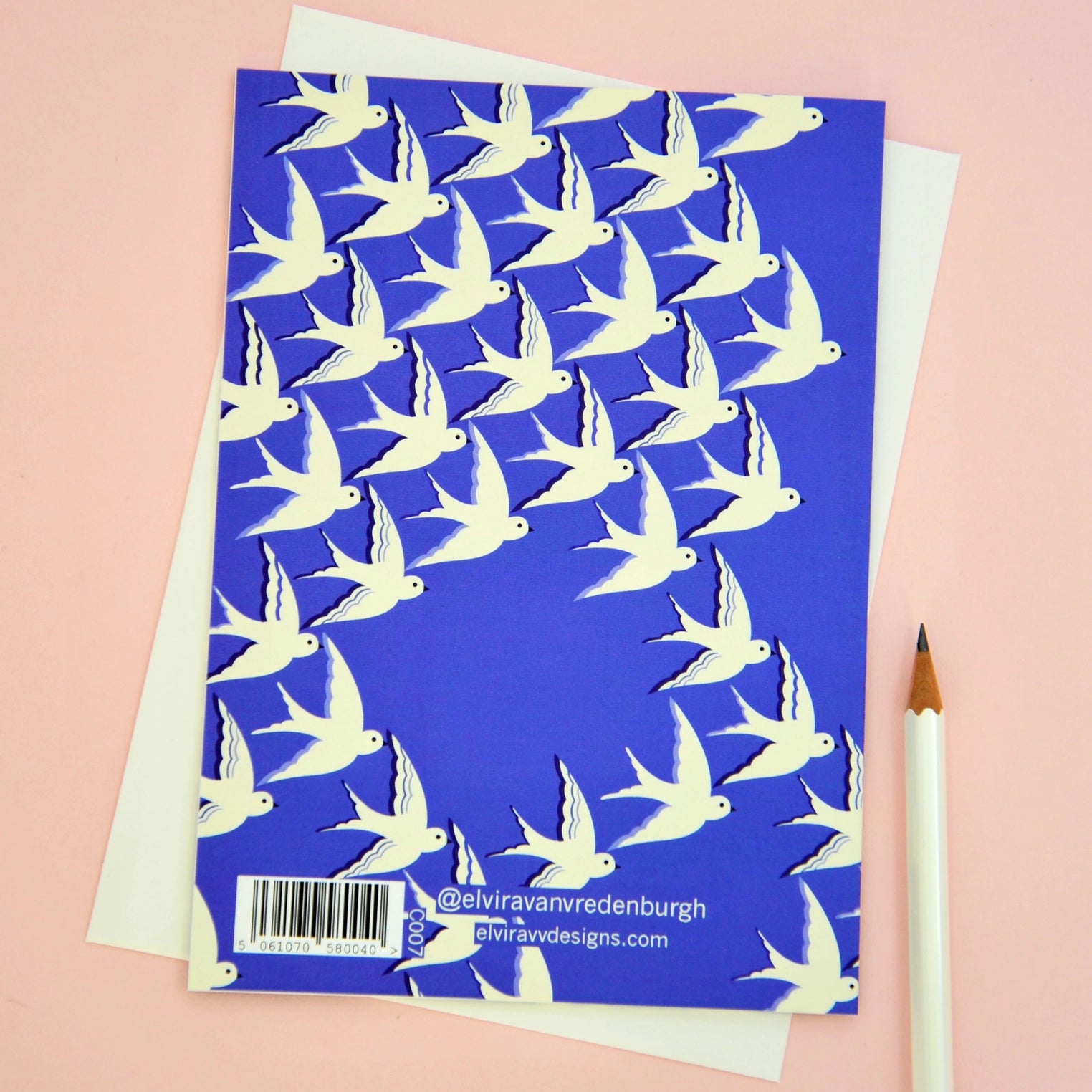 Birds inflight in blue illustrated greetings card. Colourful illustrated greetings card with formation flying bird details. Can be used for birthdays, Mother's day, weddings, anniversary and Easter.