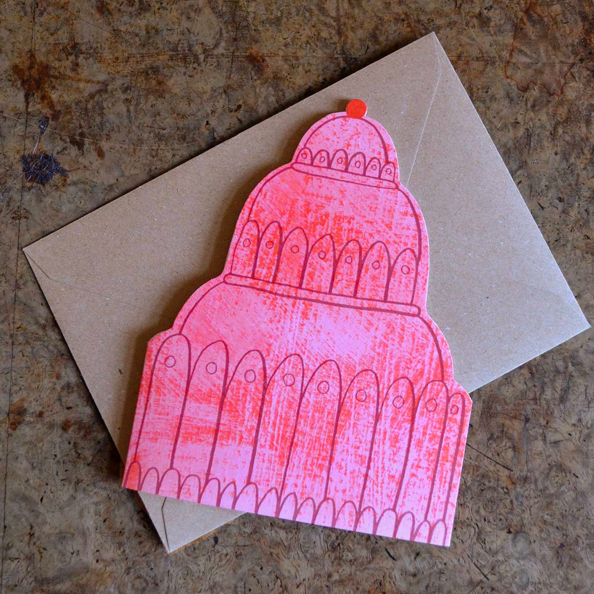 Celebrate with a (very un wobbly) jelly. These die cut cards are a reproduction of a painting by Alice Lickens-Richards and are printed in the UK on 100% recycled FSC approved paper. Each card comes with a recycled vegan envelope (no animal glues used here) and is packaged in a fully compostable 'cello' bag made from vegetable starch.