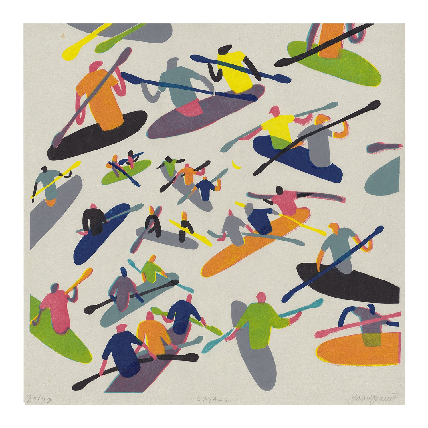 She uses vivid colours and bold shapes to create detailed, textured prints which have a sense of movement and strong graphic quality. Her paintings celebrate snapshots of a place at a specific time, like a photograph taken as a tourist to keep.