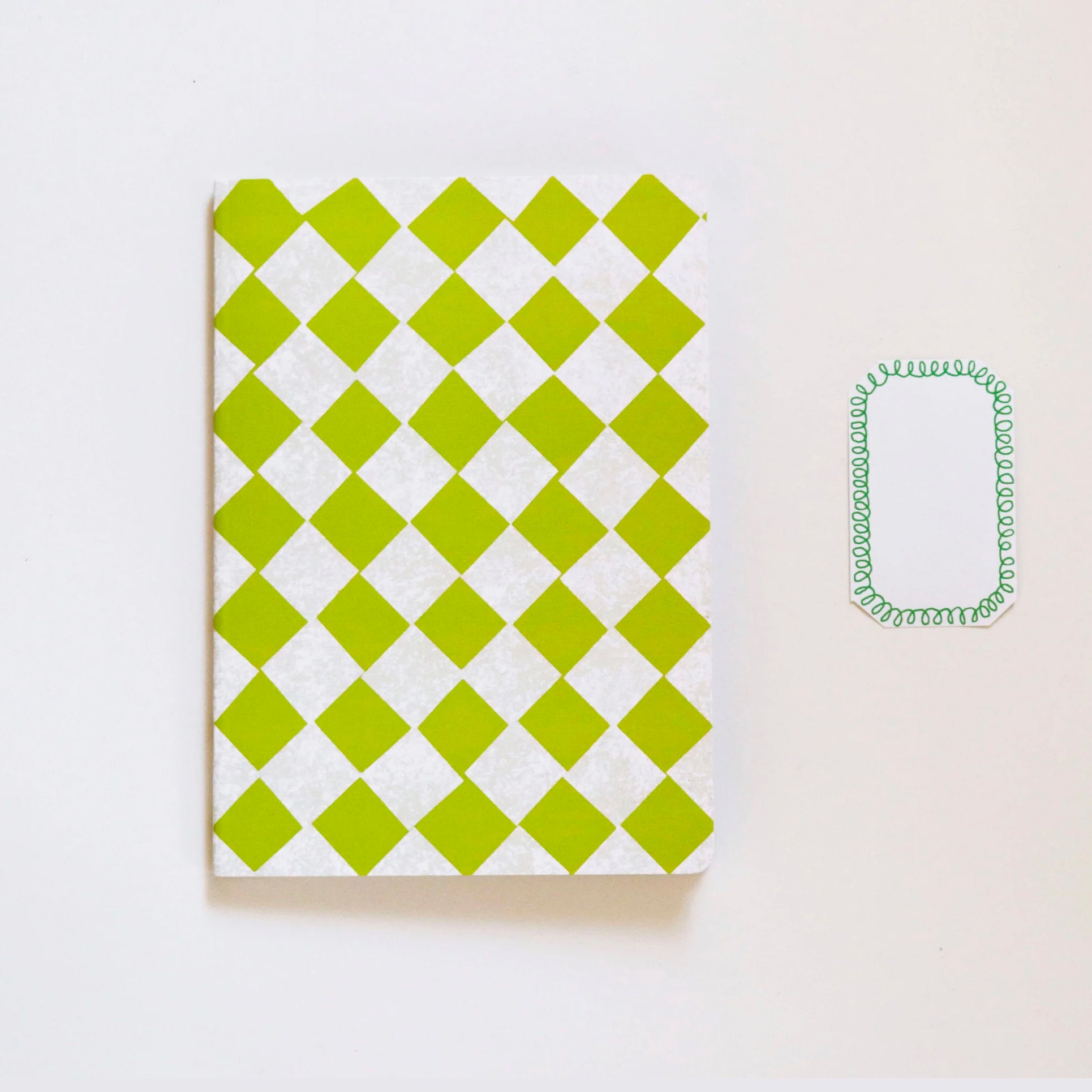 This Sketch/Note book features a chequered lime and white collage cover with contrasting colourful pink inside cover.