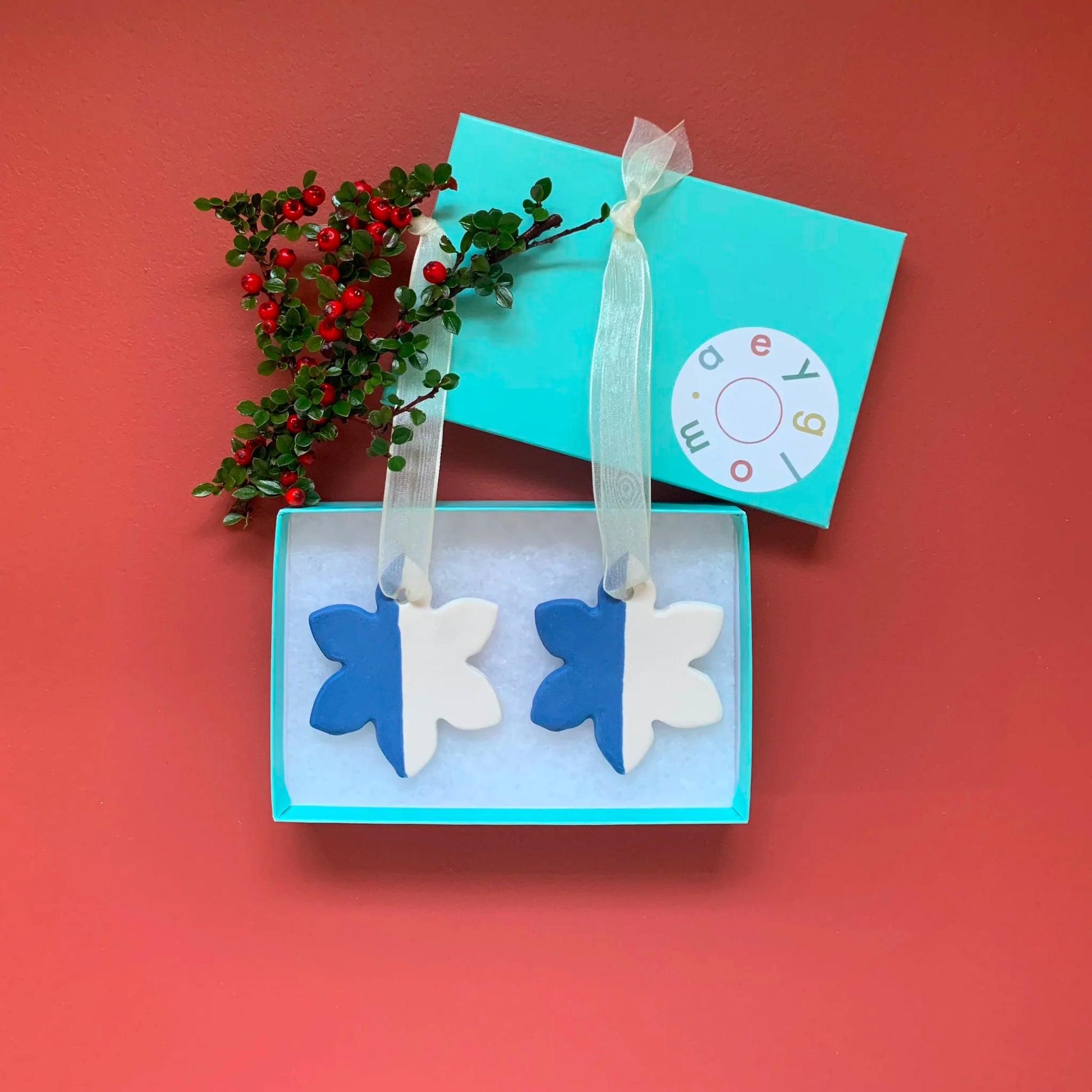 Adding some vibrant colours to your festive tree. These little snowflakes are made from porcelain and then dipped in coloured slip.