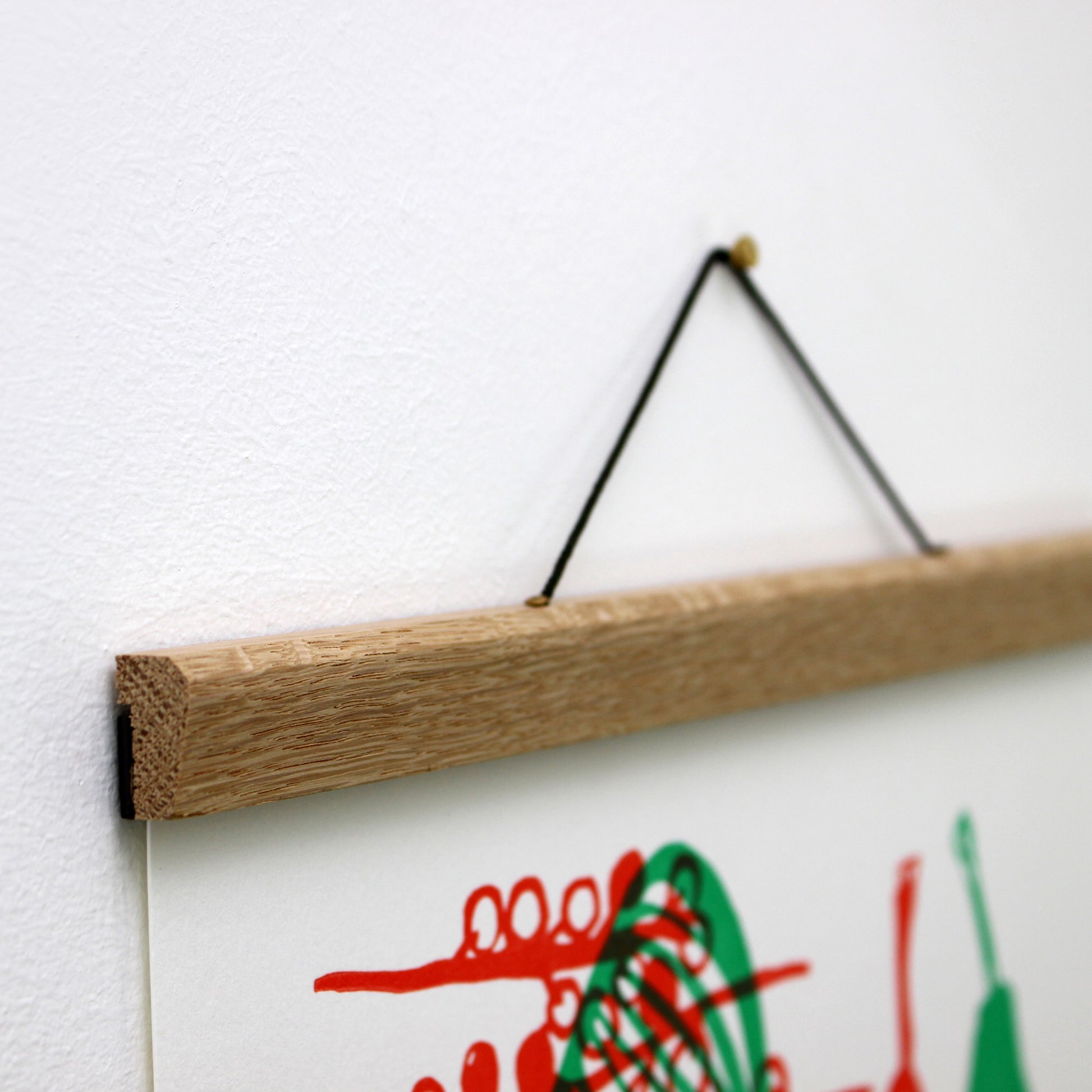 Oak poster hanging bars with strong magnetic grips designed to work with any poster, print or photograph and even fabrics. Supplied ready to hang with a fixed cord, brass headed picture pin included.