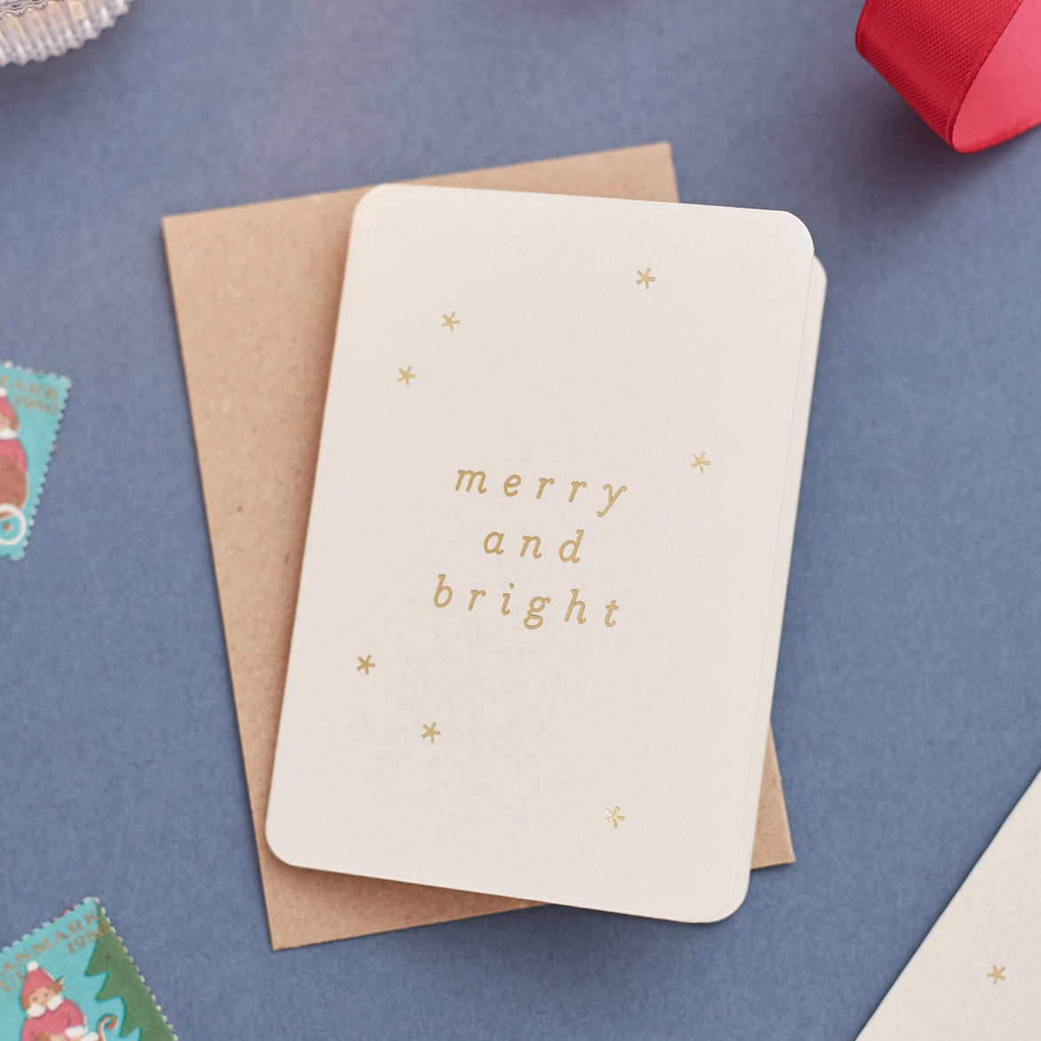 This hot foil mini Christmas card features the words “merry and bright” surrounded by scattered stars, echoing the simple beauty of vintage typewriter art. Rounded corners complete the look for a subtle, retro-inspired finish - perfect for a touch of Christmas nostalgia. Made with a premium card stock containing recycled coffee cup fibre, this holiday greeting card offers to help you stay connected in an environmentally conscious way.