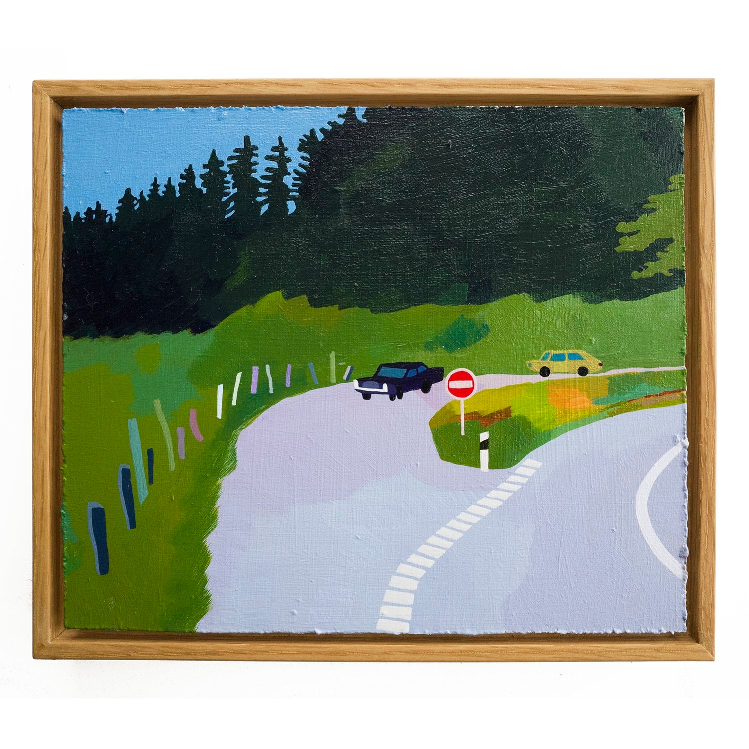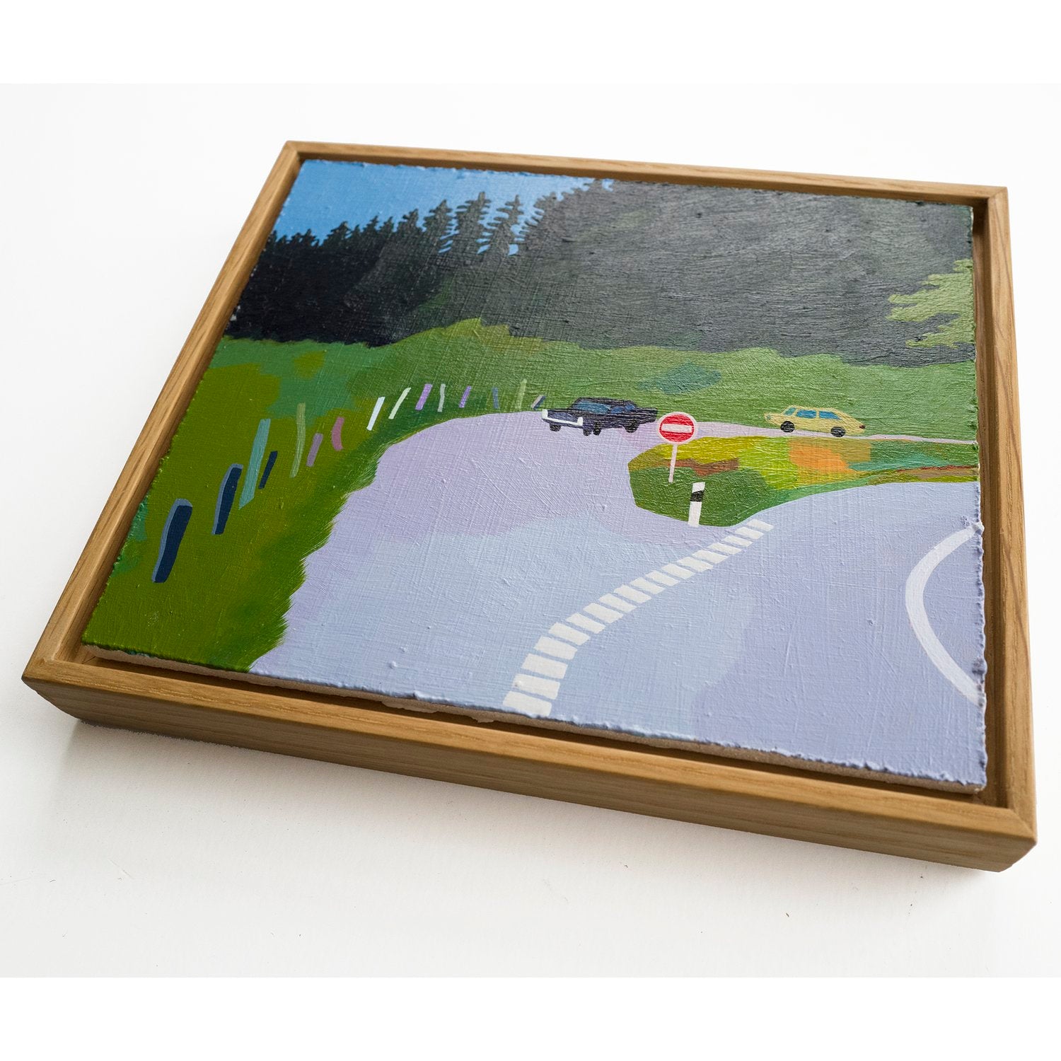 Hannah has had a fascination for painting road scenes, as much of her childhood growing up in suburban London was spent in the back seat of cars listening to tapes on her beloved Walkman. She tries to capture a dreamy, nostalgic feeling for these family holidays, driving for what felt like days, a warm feeling tinged with an uneasiness for the unexplored world that existed outside the safety of the car.