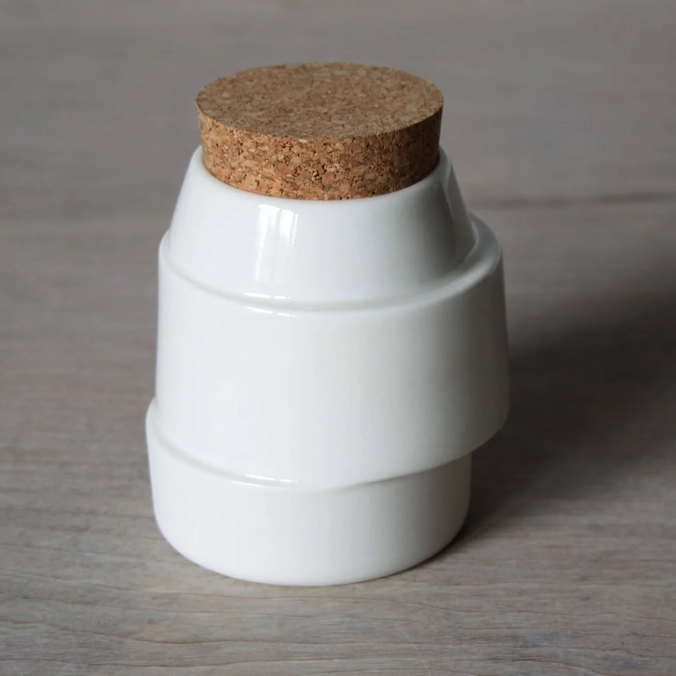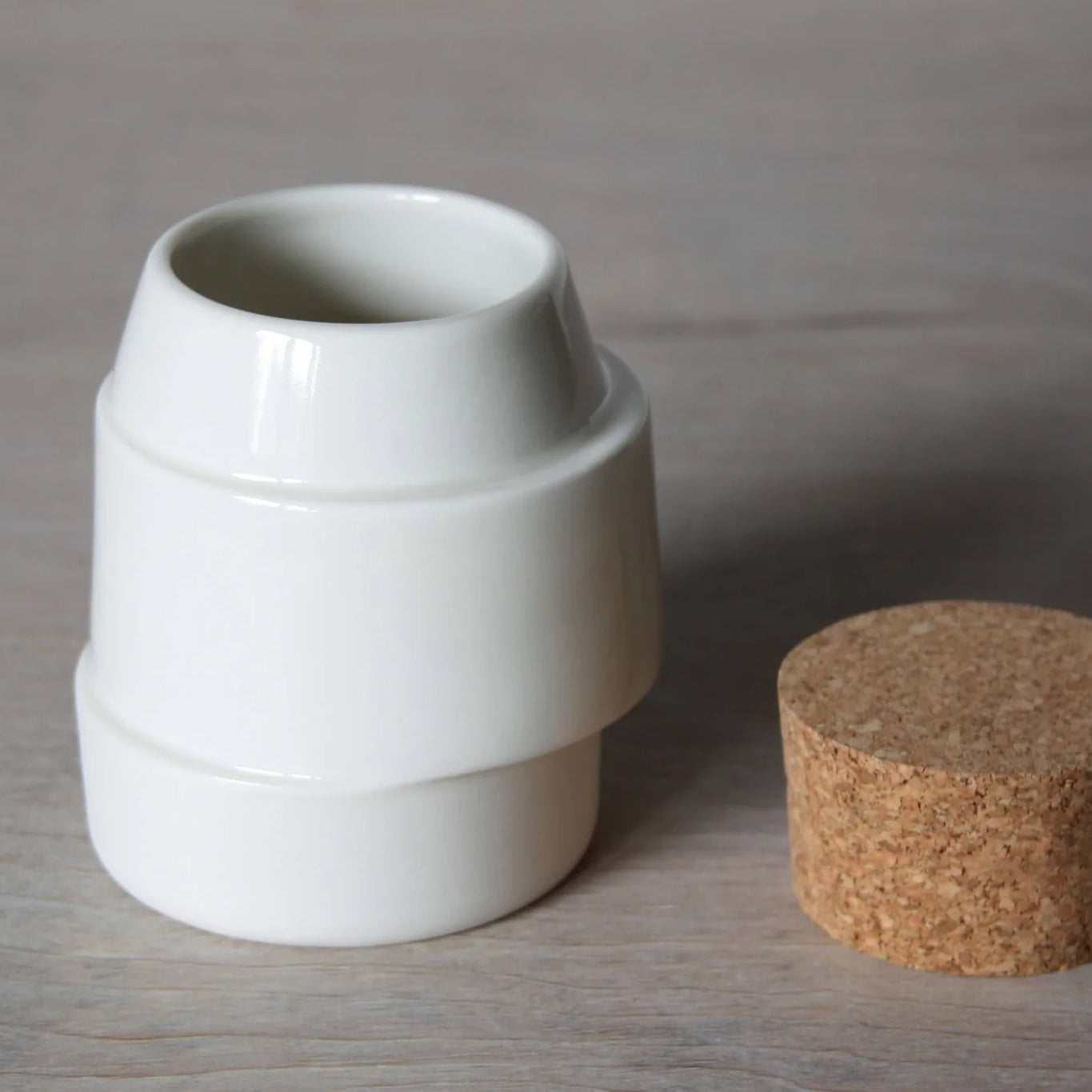A small off-centre container, created as part of the Interchangeable Mould Project. Can be used as a caddy for tea or a storage jar for other things such as sugar or coffee. Comes with cork.