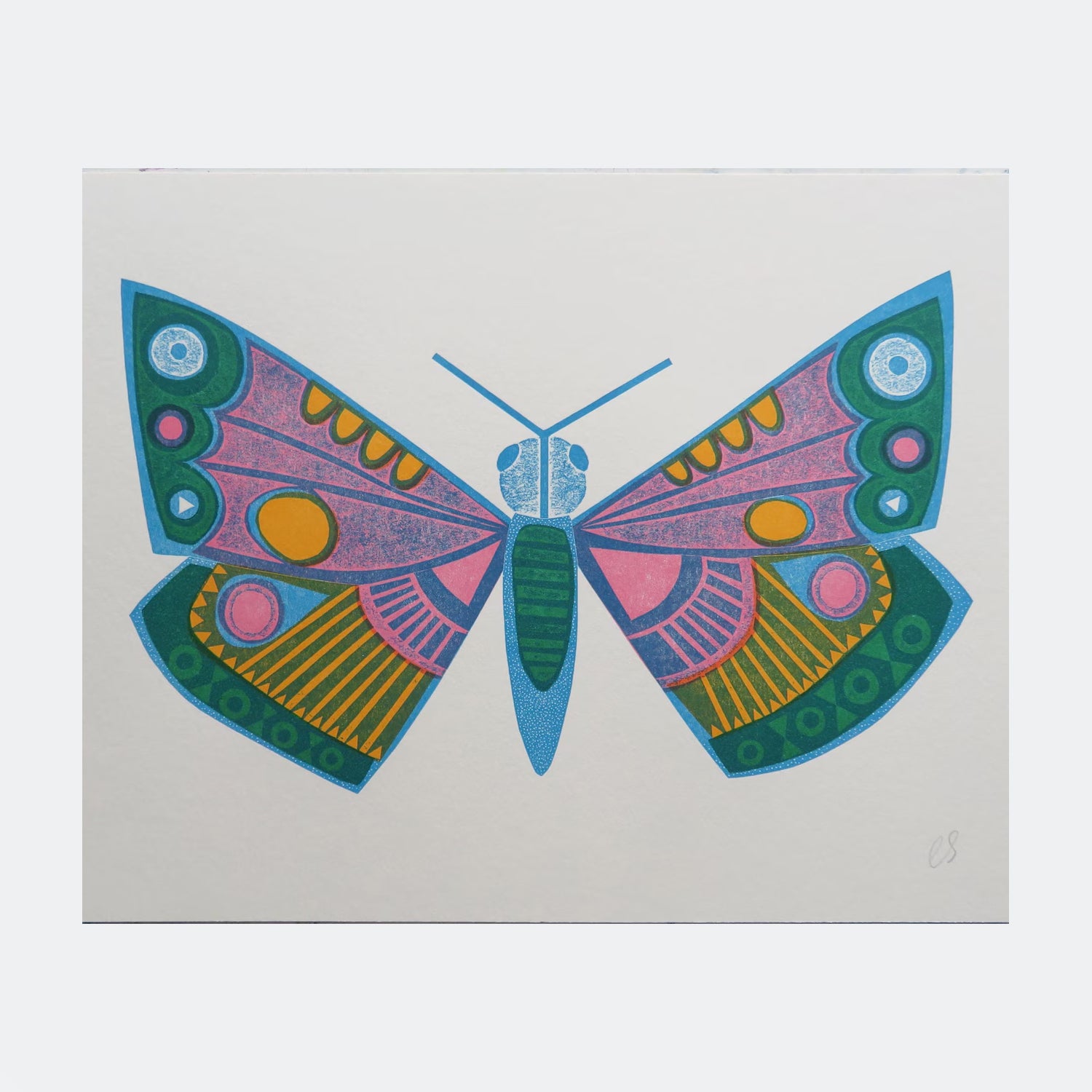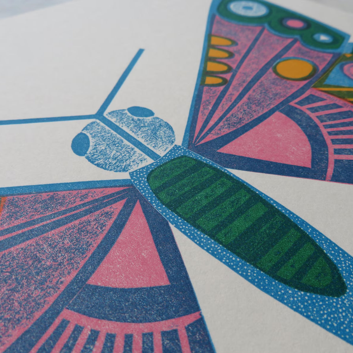Rainbow Moth. Four colour card print full of pattern, mark making and texture.