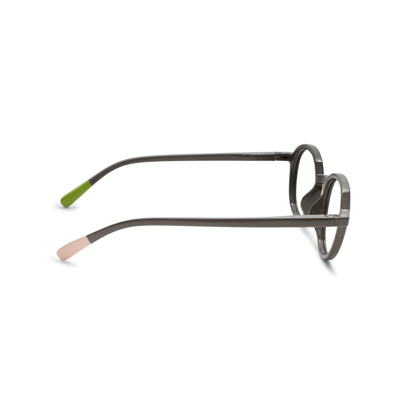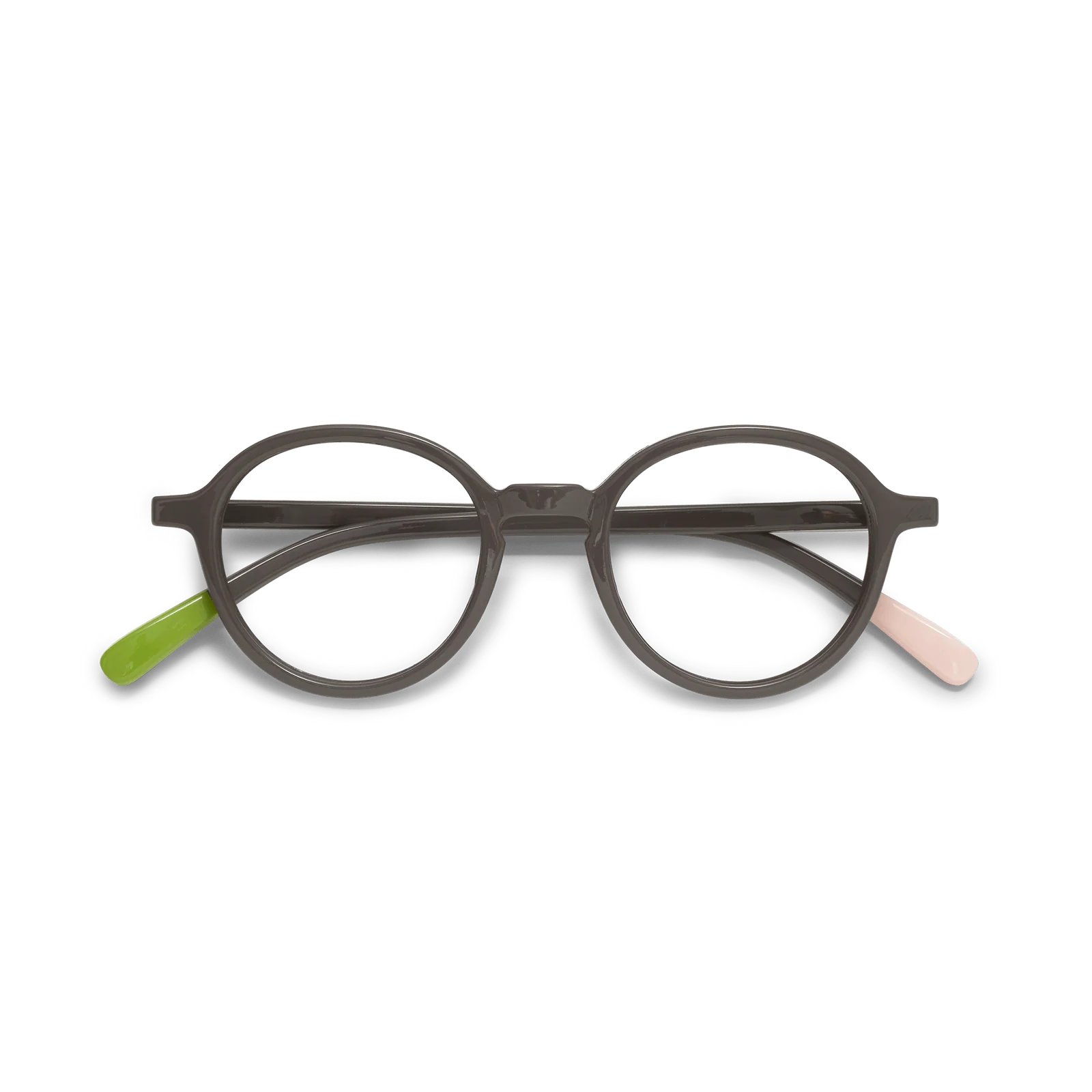 Small, round reading glasses with grey frames and a subtle colour detail on each temple tip. 'Circle Slim' by Have A Look is a timeless classic enhanced with a discreet touch of colour, making this style the perfect choice if you appreciate eyewear that stands out without being too loud.