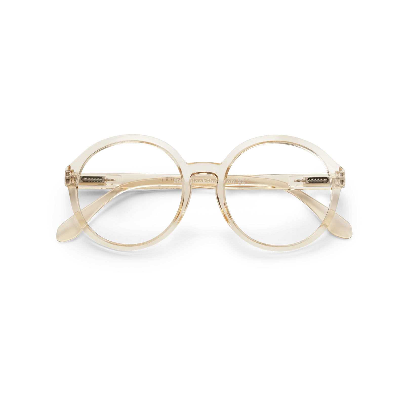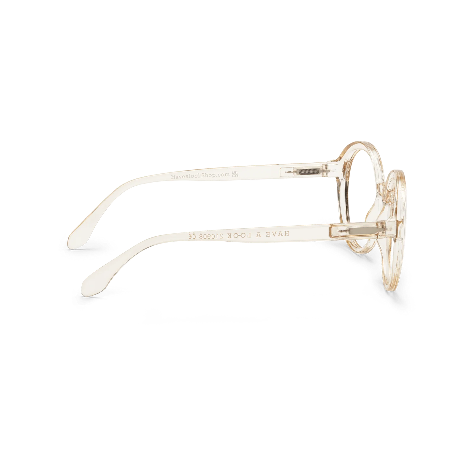 Large, round reading glasses with a champagne coloured frame. 'Diva' by Have A Look are large, elegant, lightweight, and exceptionally comfortable, making them the perfect choice if you love sizable yet stylish frames. This design complements square, oval, and triangular face shapes, enhancing your unique look.