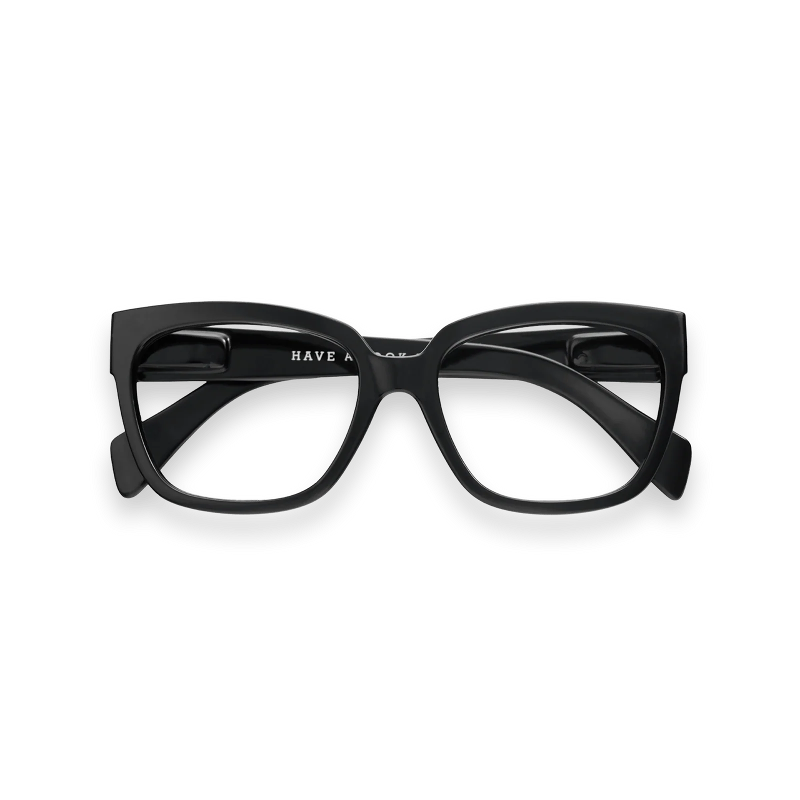 Oversize, rectangular reading glasses, 'Mood' by Have A Look are large, bold, and lightweight on the nose. They feature rectangular frames with a subtle uplift in the upper corners, enhancing your facial features. ‘Mood’ is a flattering choice for those with round, oval, and heart-shaped faces.