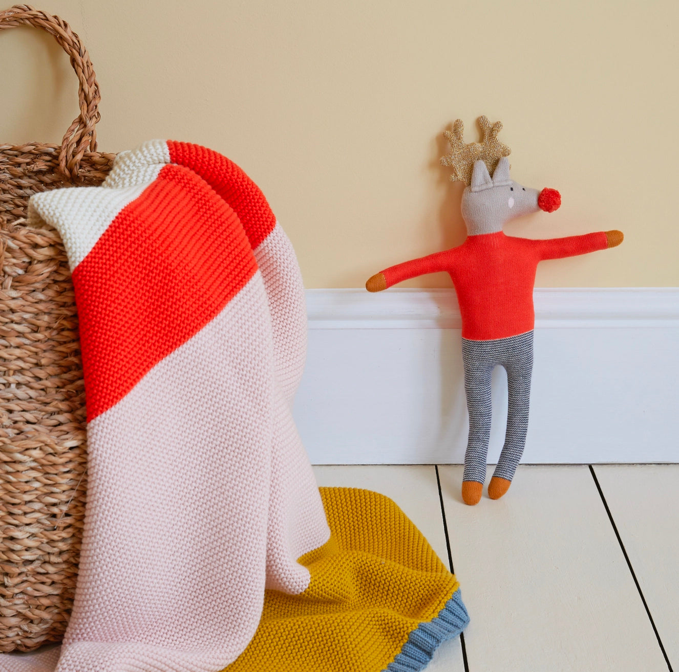 This guy is stuffed with our market-leading biodegradable polyester filling! As well as being UKCA & CE tested, machine washable, knitted using azo-free dyes and like all the cotton knit nursery accessories and toys, this knitted reindeer doll is CE tested, as well as machine washable so you can let them chew away!