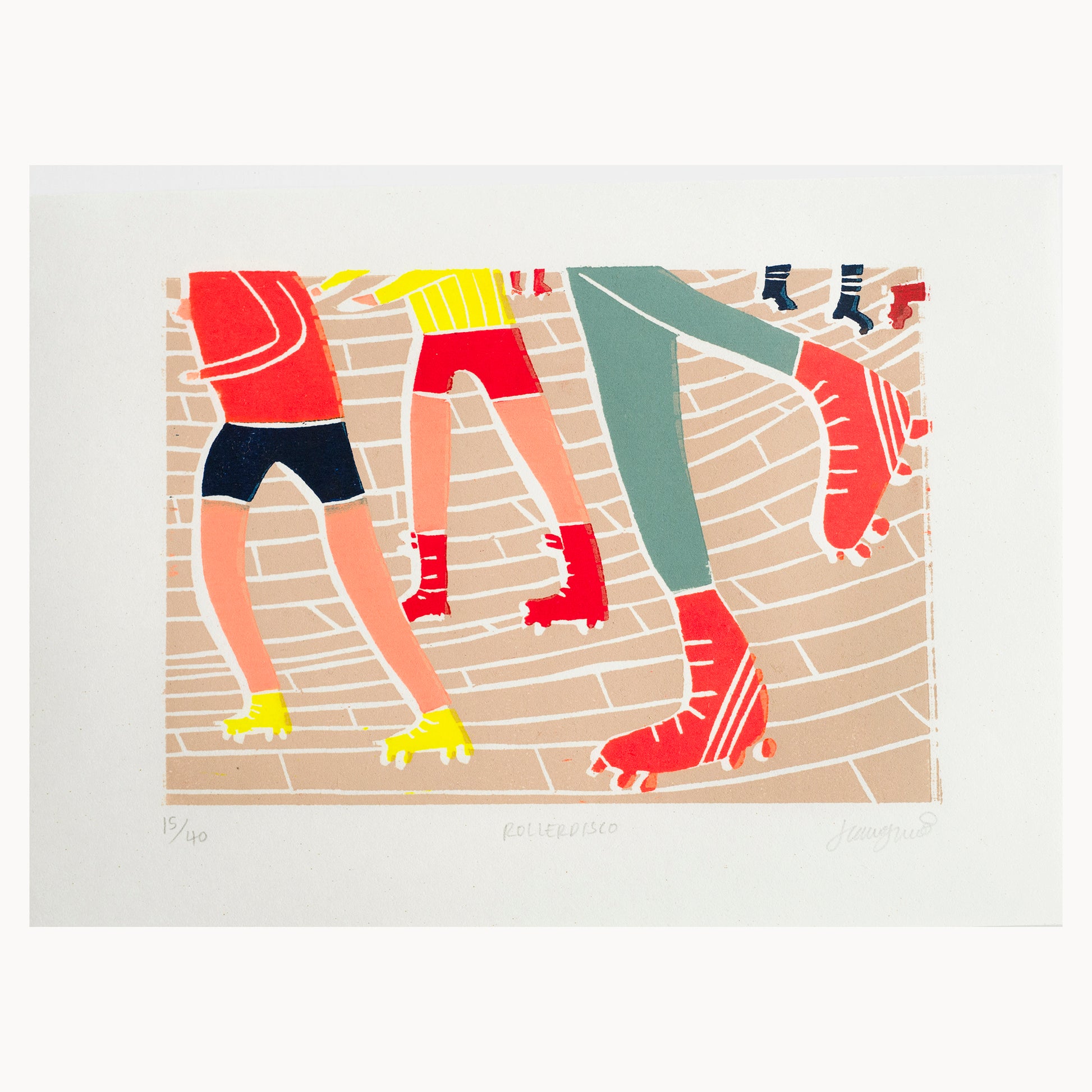 Printed using oil based printmaking inks including fluorescent orange and yellow.