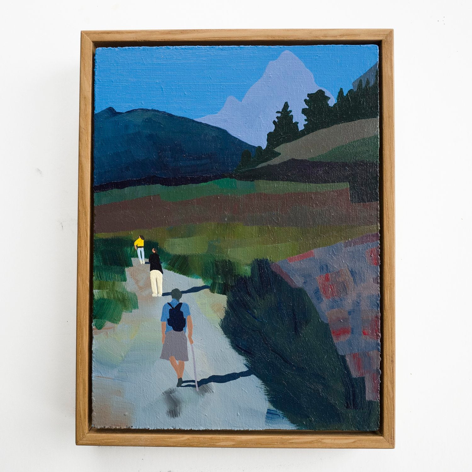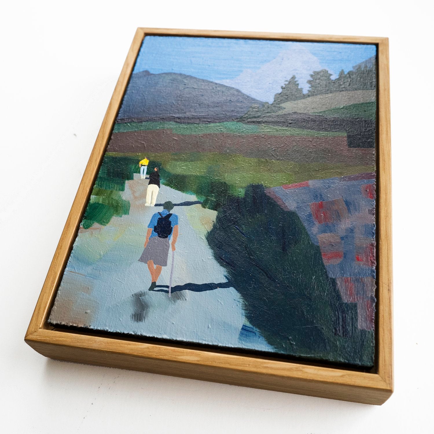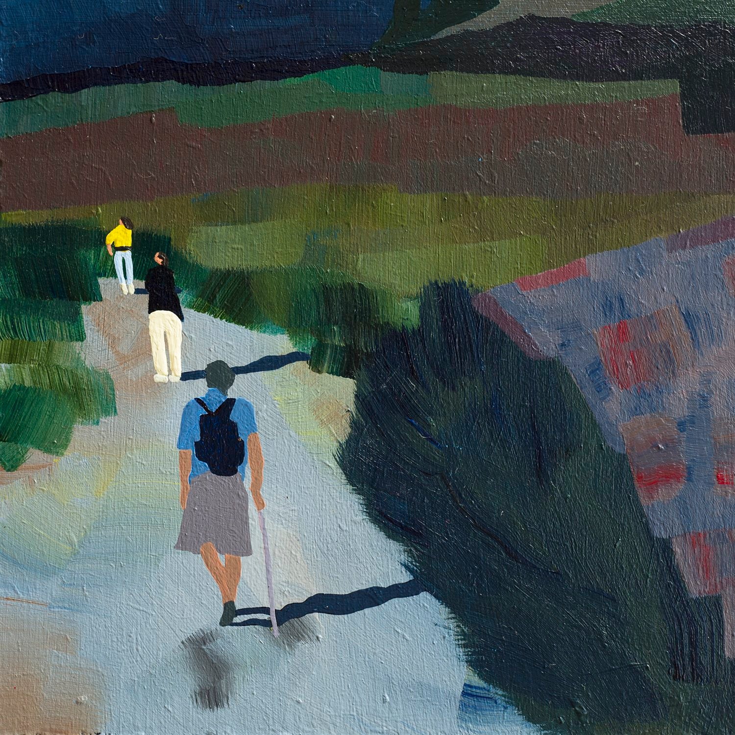 Hannah has had a fascination for painting road scenes, as much of her childhood growing up in suburban London was spent in the back seat of cars listening to tapes on her beloved Walkman. She tries to capture a dreamy, nostalgic feeling for these family holidays, driving for what felt like days, a warm feeling tinged with an uneasiness for the unexplored world that existed outside the safety of the car.