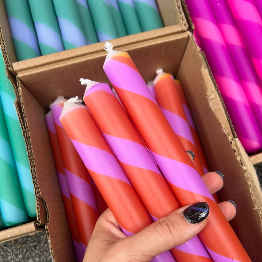Each candle is hand dipped in the Surrey Hills and every set is unique - the bright colour combination is always the same but the pattern may vary ever so slightly due to the handmade nature. Hop on the colourful candle trend and add some joy and atmosphere to your home.