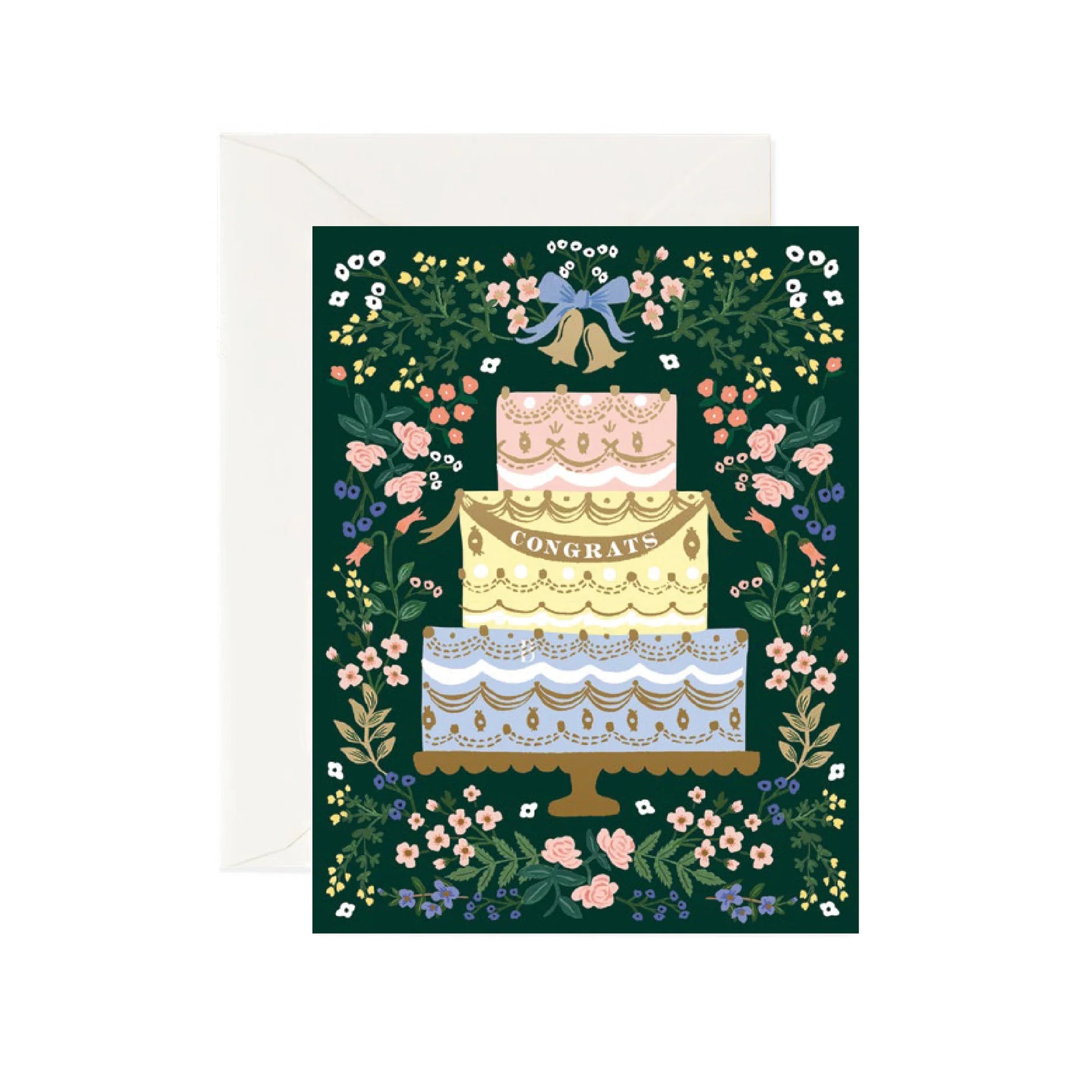 Rifle Paper Co woodland wedding card, floral wedding cake design decorated with pretty gold foil detail.